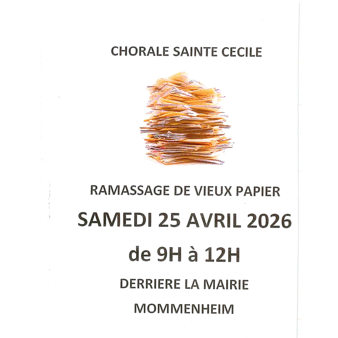 La Chorale Sainte Cécile organise un ramassage de vieux papiers.